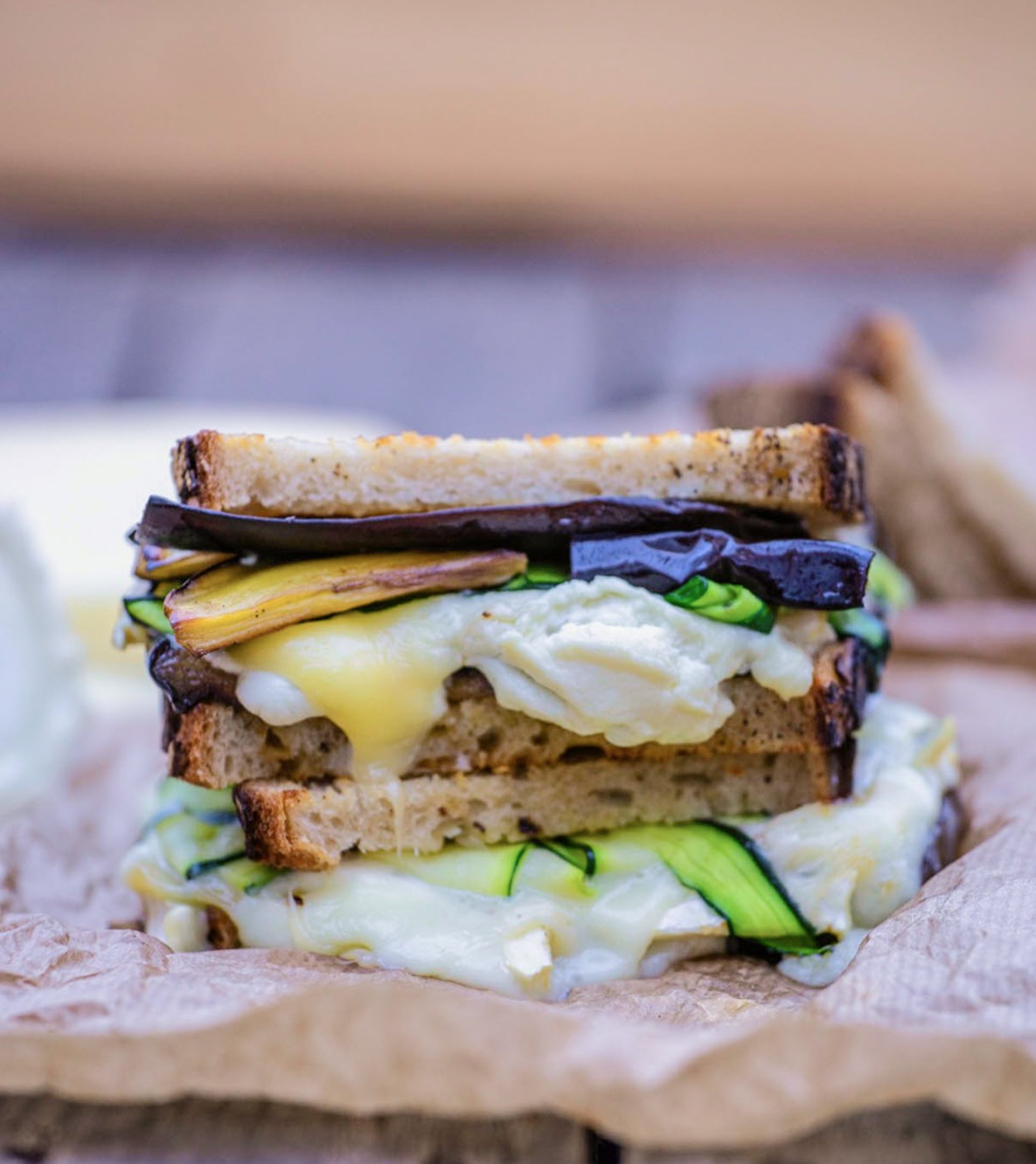 Un gros sandwich chaud au fromage fondu et légumes cuisinés, coincés entre 2 tranches de pain au levain toasté.